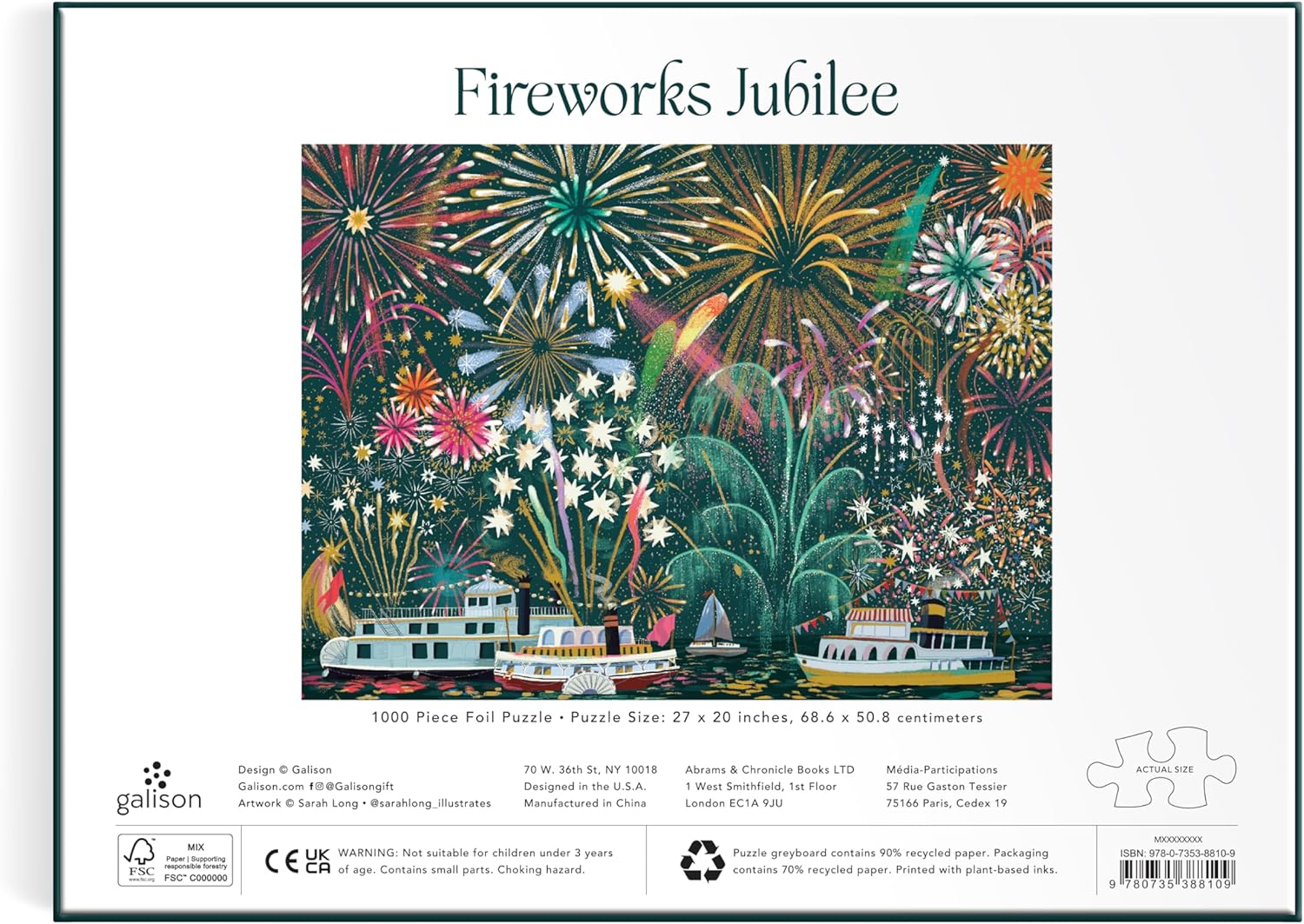 Experience the magic of a nighttime celebration with the Fireworks Jubilee 1000 Piece Foil Puzzle. This stunning puzzle captures a dazzling display of fireworks lighting up the night sky, with a serene waterway below, dotted with boats and reflecting the vibrant colours above. Each piece sparkles with a touch of foil, bringing the excitement of this fiery spectacle to life in your hands. With 1000 pieces to arrange, this puzzle provides both a challenge and a visual feast as you piece together a dazzling scene of celebration and joy.