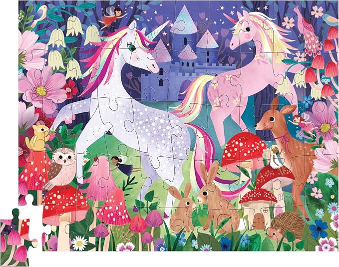 Enter a magical kingdom! Our 50-piece Unicorn Castle puzzle in a house-shaped box will delight any little dreamer enchanted by unicorns and fairy tales. Featuring bold colors and whimsically illustrated unicorns in their magical castle, this puzzle encourages hand-eye coordination and problem-solving. Great for interaction between a parent and child that can be used over and over. A sturdy house-shaped box makes for easy storage and its small size is perfect for travel.