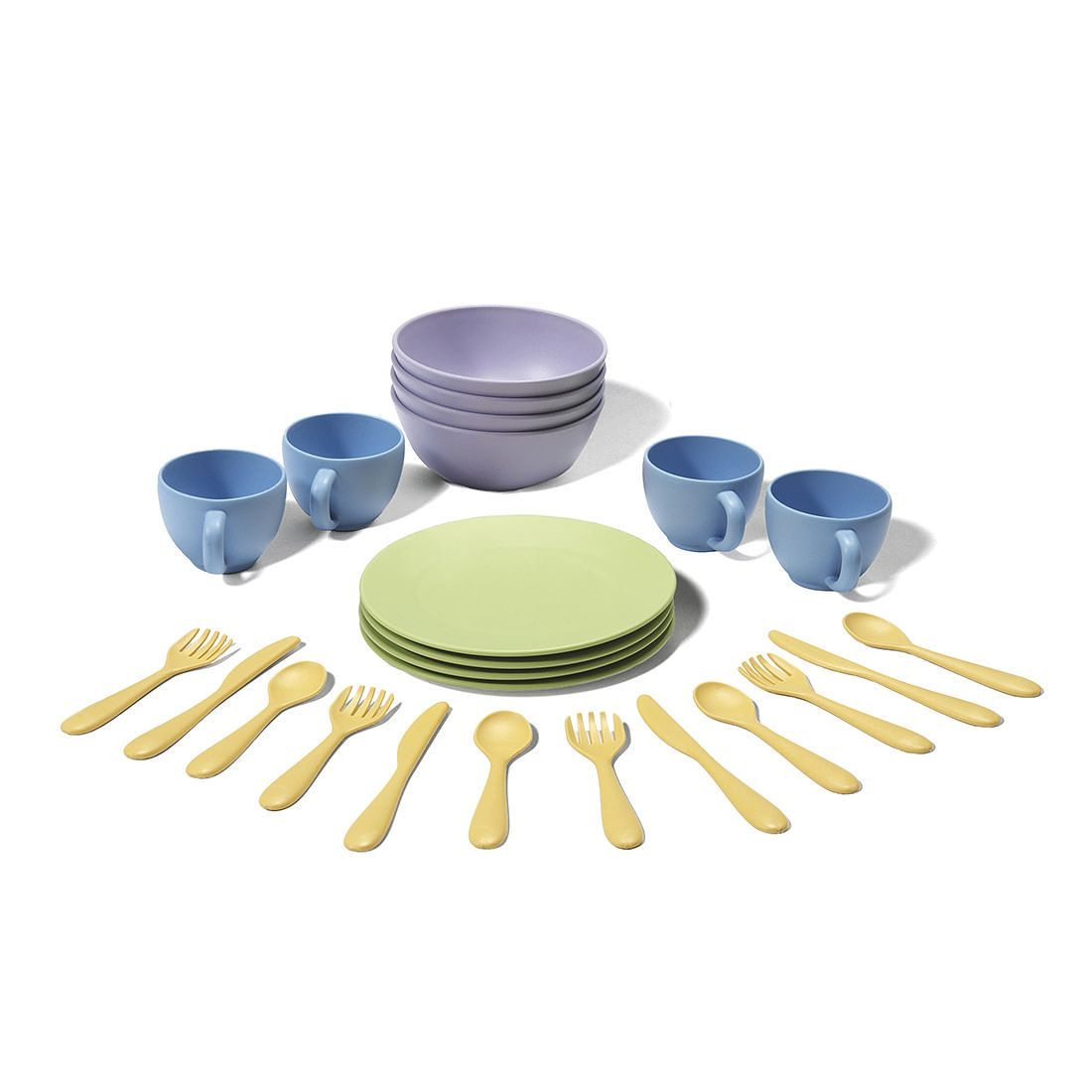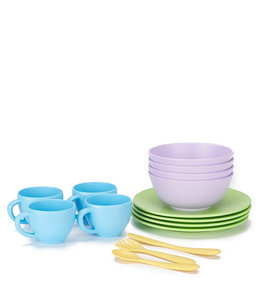 It’s dinnertime with the world’s most environmentally friendly dish set!Includes everything you need to serve a meal for four, and do something great for the planet. The Green Toys Dish Set is made in the U.S.A. from 100% recycled plastic milk containers that save energy and reduce greenhouse gas emissions. This set gives new meaning to the term “clean plate.”Suitable Ages: 2+ years.