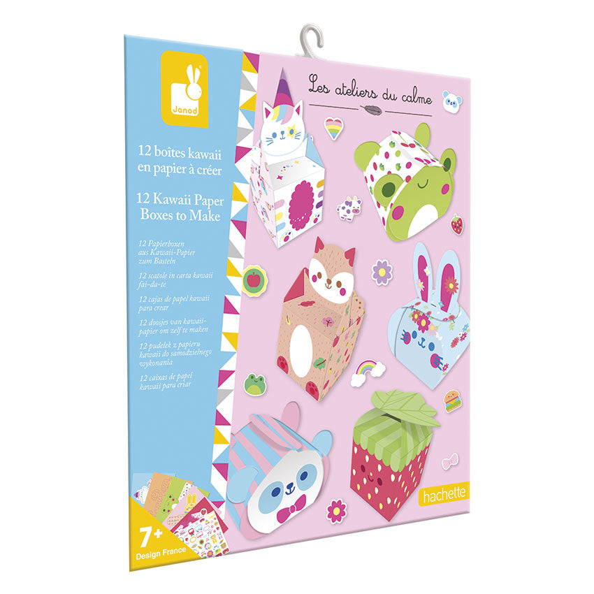 Embrace the adorable world of kawaii with this delightful Paper Box Craft kit! 'Kawaii' means cute in Japanese, and these sweet, colourful characters are full of irresistible charm. With this kit, children aged 7 and up can create 12 super cute paper boxes, choosing from 6 different kawaii designs. It's simple and fun: just pop out the pre-cut shapes, follow the step-by-step folding instructions, and finish by decorating with stickers! The set includes 12 pre-cut paper sheets, a sheet of cute stickers, and a detailed instruction booklet. Each box takes around 5 minutes to complete and can help develop patience, fine motor skills, and creativity. Part of the playful Janod Art And Craft range, it's ideal for little artists who love all things cute and fun!
