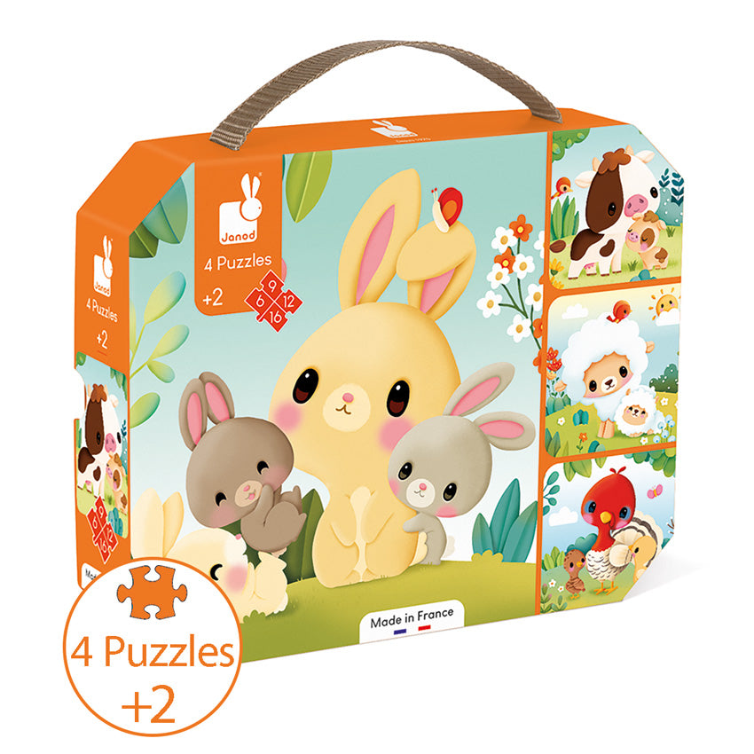 With these 4 progressive puzzles, your child can construct different scenes illustrating a rabbit and its babies, a sheep and its lamb, a cow and its calf, and a turkey and its chicks. The puzzles have a progressive number of pieces to help children develop their puzzle skills. Start with a 6-piece puzzle, and then a 9-piece puzzle. Once your child feels comfortable with these, they can continue with the 12 and 16 piece puzzles. The back of each puzzle is a different colour to help children find the right pieces! These 6, 9, 12 and 16-piece progressive puzzles are ultra-portable, thanks to the attractive suitcase-shaped box. Made in France from FSC certified sturdy cardboard and coloured with vegetable-based ink. Ideal for children from the age of 2.