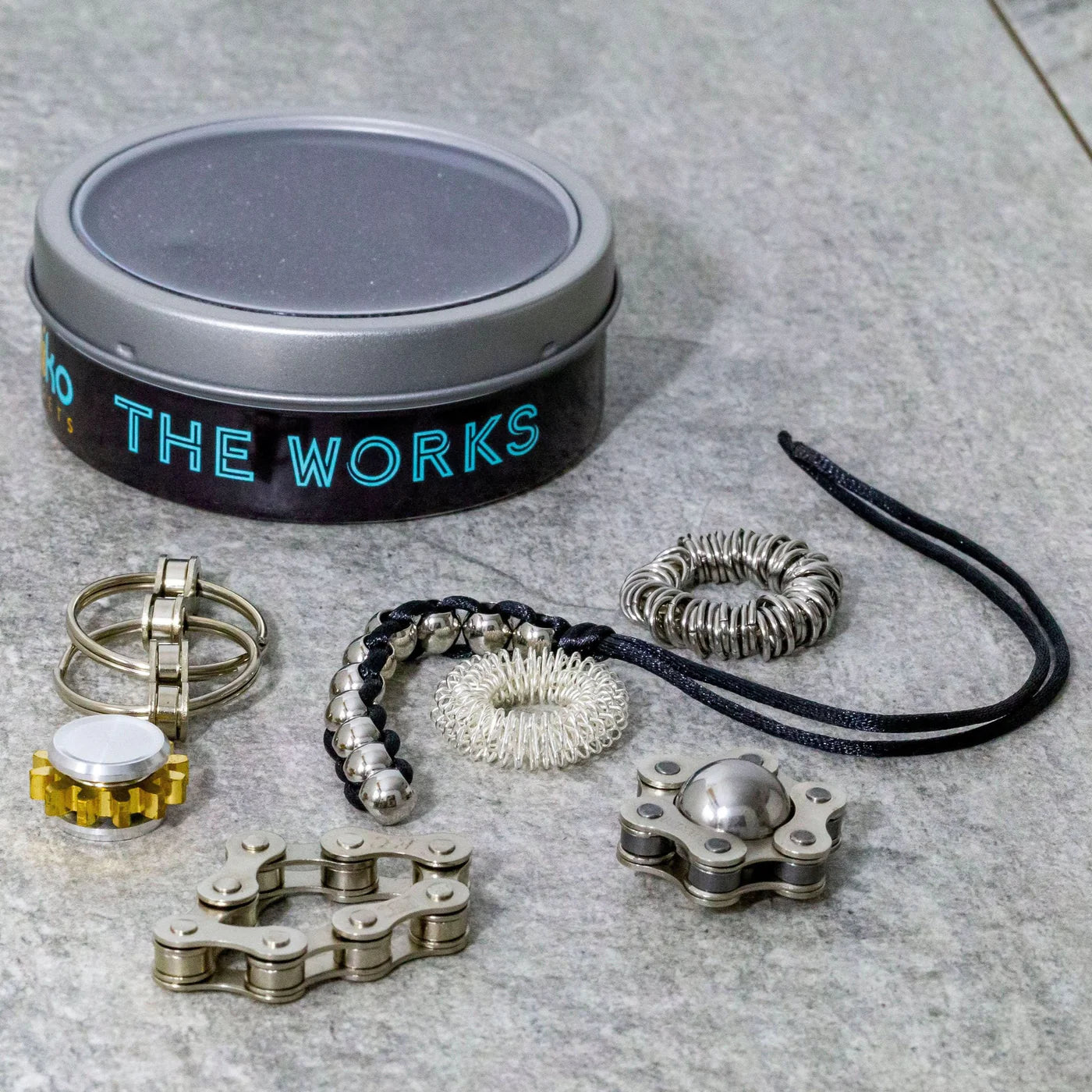 "Being newly diagnosed with ADHD and allowing myself to fidget openly for the first time, I purchased the 'The Works' kit to find my preferences for fidget toys. I am in love with the beautiful colours of the oil slick finish, and find myself picking up the caterpillar and the double loop fidgets to most, with the finger spikey being a close second. Lauren Nov. 2023."