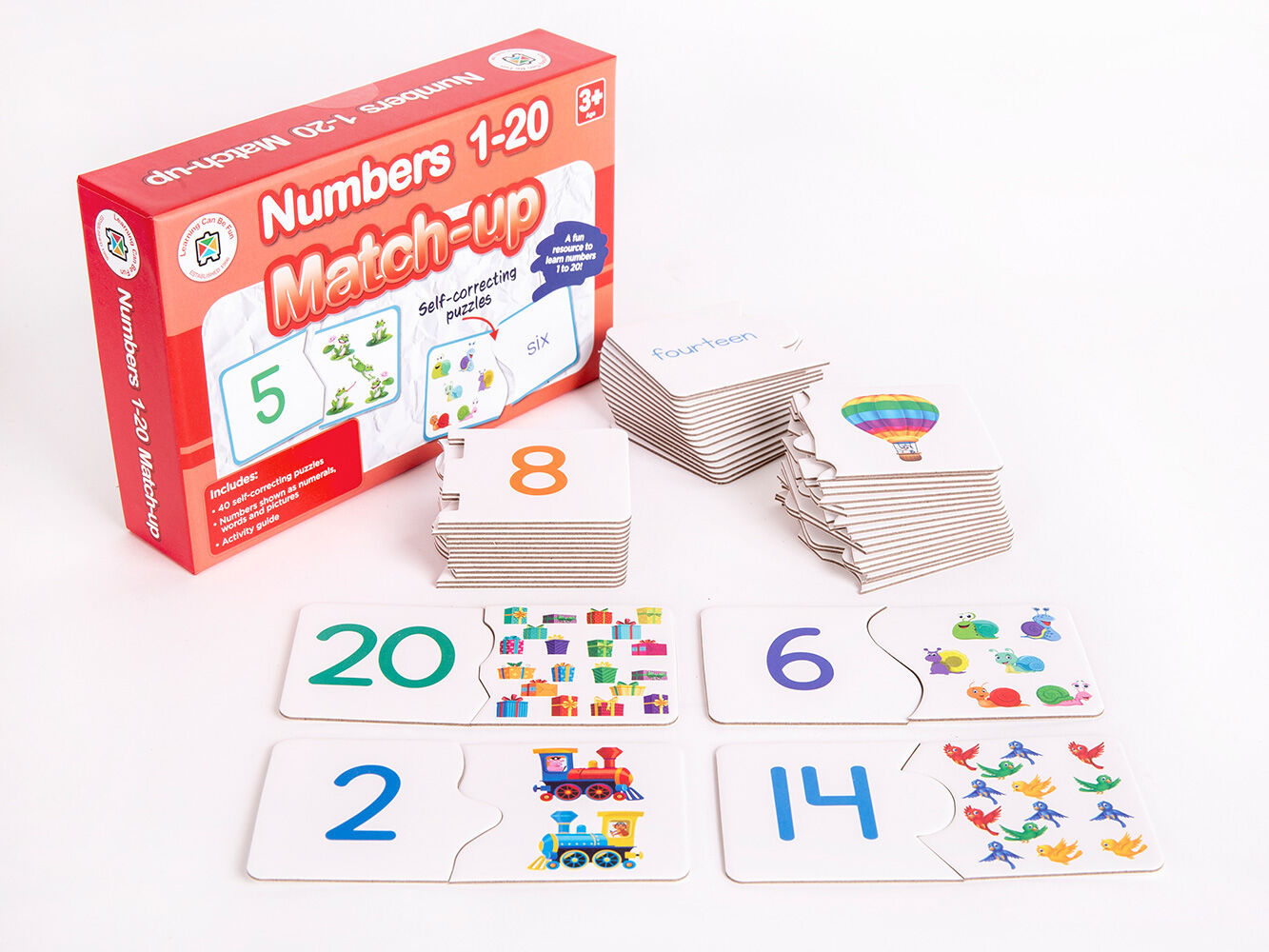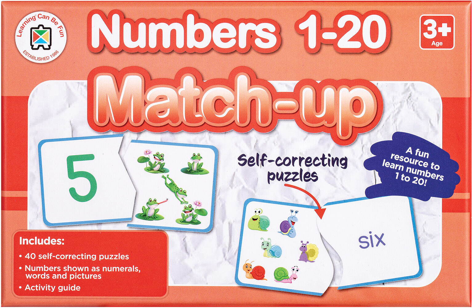 Match-Up Number 1-20 is a self correcting game that has been created to help children make the early links between words, numerals and images. As well as reinforcing the concept of counting, Match-Up helps children to recognise the digits from 1-20 and the words representing those numbers. The game has different levels which can be matched to the appropriate numerical ability level. Each of the 60 dominoes has an individual puzzle cut so only the correct numbers will Match-up! Detailed Activity guide included.
