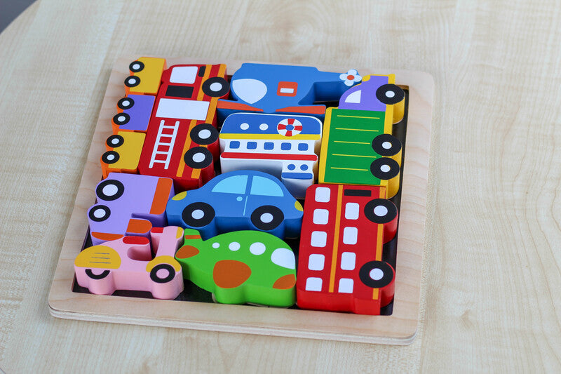 A bright, chunky vehicles puzzle. The design features fantastic solid shapes for young hands to manipulate. Puzzles are a great opportunity to grow your child's gross and fine motor skills, hand and eye coordination, problem-solving, shape and colour recognition skills.