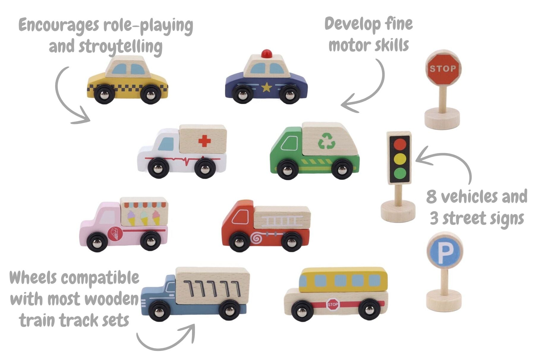 All aboard for endless imaginative adventures! The Wooden Box Transportation and Street Sign Set from Kaper Kidz is a delightful collection of vehicles and road signs, perfect for little city planners and future drivers. This charming 12-piece set includes 8 wooden vehiclesa taxi, police car, school bus, ice cream truck, garbage truck, ambulance, delivery truck, and fire truckplus 3 essential street signs (STOP, traffic light, and parking) and a sturdy wooden display box for tidy storage. Crafted from durable wood and painted with vibrant, non-toxic, child-safe paints, the Wooden Box Transportation and Street Sign Set from Kaper Kidz encourages imaginative storytelling, teaches road safety awareness, and supports fine motor development and vehicle recognition skills. It's the perfect blend of fun and learning for playtime on the go!
