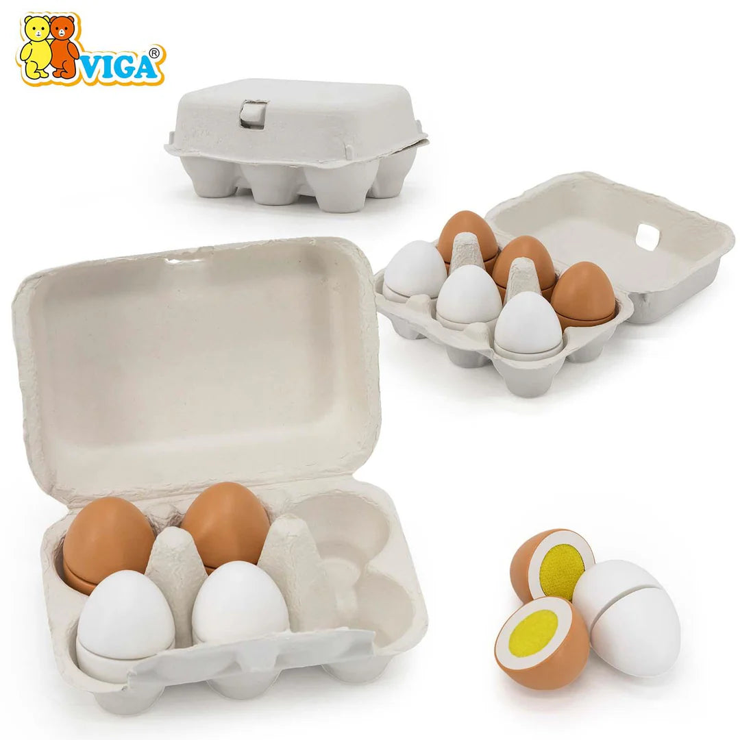 This wooden play egg set by VIGA is a perfect addition to any childs pretend kitchen or market play. The set includes 6 realistic wooden eggs. 2 Years +